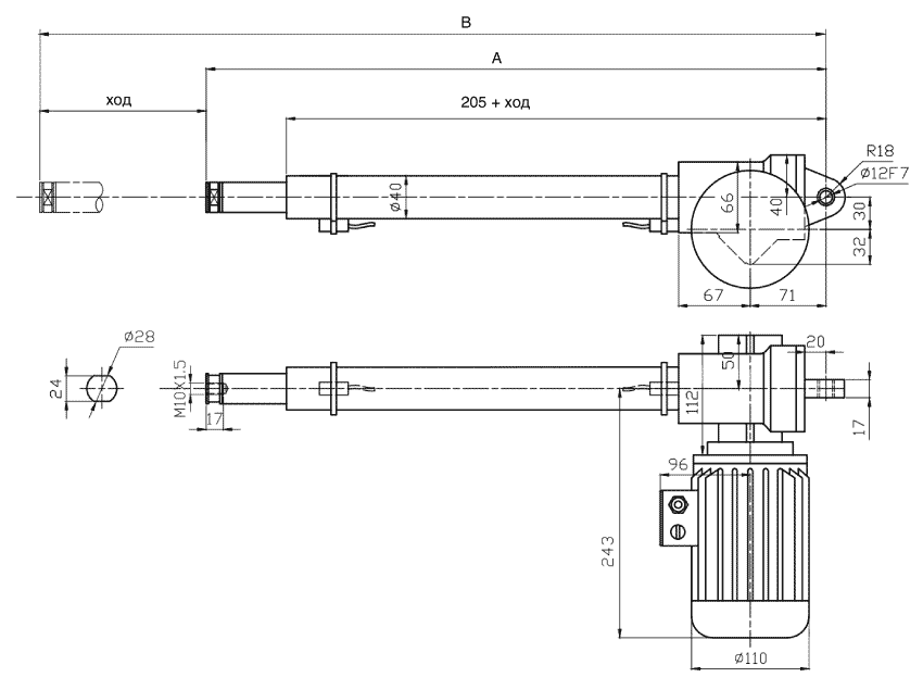 Габаритные и присоединительные размеры линейного актуатора с перпендикулярным расположением вала LAP28-N2-200