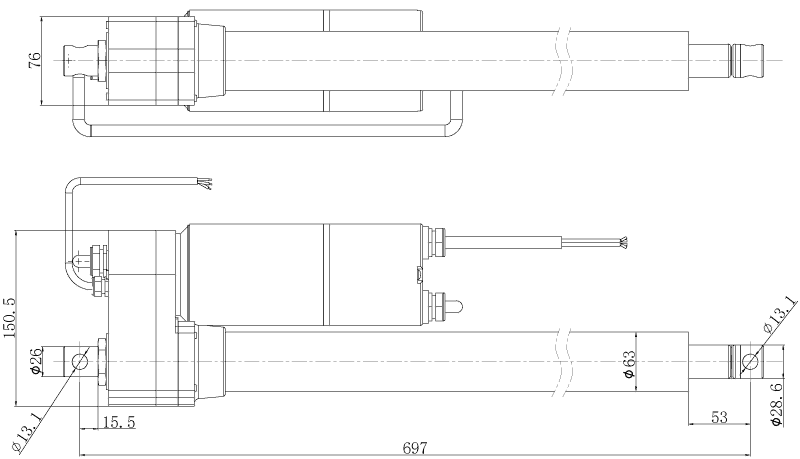 Габаритные и присоединительные размеры линейного актуатора с параллельным расположением вала LBM9-S2-300-ROE-AC-220V