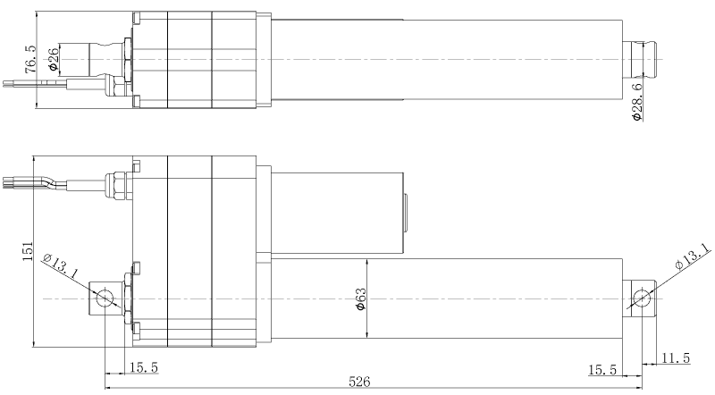 Габаритные и присоединительные размеры линейного актуатора с параллельным расположением вала LBM9-S2-300-ROE-DC-24V
