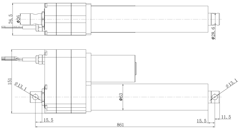 Габаритные и присоединительные размеры линейного актуатора с параллельным расположением вала LBM9-S2-600-ROE-DC-24V